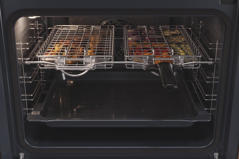 Doté d’une surface XXL composée de deux grilles ajustables, il fonctionne avec la position « Gril » du four. Sa poignée amovible dédiée permet de retourner simultanément les deux grilles en toute sécurité, sans risque de brûlure, d’éclaboussure ou de chute des aliments.