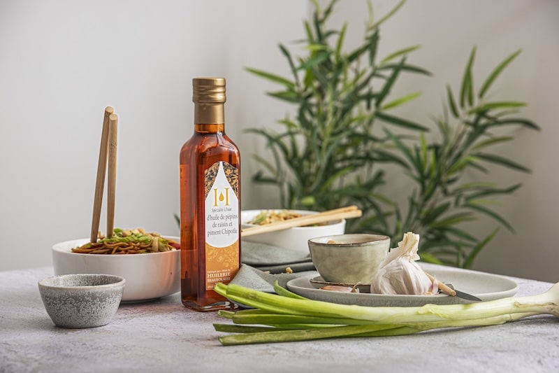 - Une huile de pépins de raisin française infusée au piment chipotle fumé
