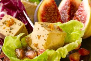 Parfaites pour un apéritif de fête, ces petites bouchées de foie gras en cœur de salade se savourent avec des figues fraîches.