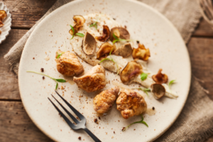 Imaginés par Charline Stengel, ces ris d’agneau façon cannelés sont flambés au rhum et servis avec des topinambours, des cèpes et des miettes de cannelés.