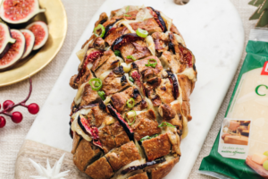 Parsemée de fromage râpé, cette brioche tressée surprise au Beaufort est garnie de tapenade d’artichaut et de duxelles de champignons. C’est un délicieux apéritif.
