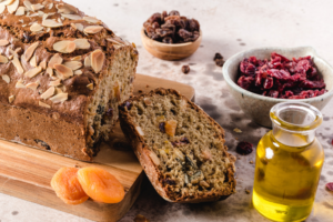 Garni de noisettes, d’amandes, de graines de courge, et de fruits secs, ce gâteau du petit déjeuner à l’huile d’olive et à la farine d’épeautre ...