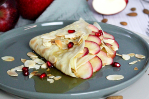 Régalez-vous avec ces crêpes légères au lait d’amande, garnies de lamelles de pommes caramélisées et d’amandes effilées toastées, servies avec un peu de sirop d’érable.