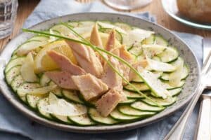 Avec une sauce au citron et à l’huile d’olive et quelques copeaux de fromage de brebis, ce carpaccio de courgettes au thon blanc est une ...