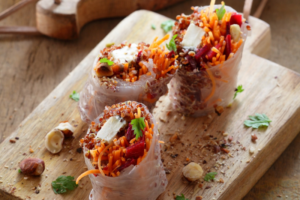 Veggies mais gourmands, ces rouleaux de printemps au Selles-sur-Cher sont garnis de petits légumes, de noisettes et de quinoa rouge. Il se dégustent avec une ...