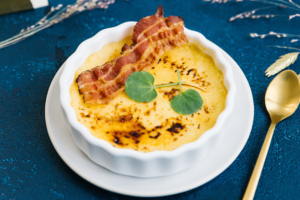 Servez ces crèmes brûlées au Pont L’Evêque accompagnées de lard croustillant et de quelques pousses d’épinard, pour la bonne conscience.