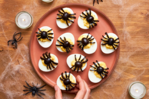 Décorés d’olives noires savamment taillées, ces œufs mimosa araignées sont parfait pour une entrée ou un apéritif effrayant.