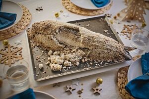 Mulet en croûte de sel, herbes fraîches et baies roses