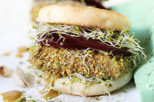 Réalisé dans des muffins anglais, ce burger végétarien est particulièrement gourmand grâce à ses pistaches grillées au piment doux et sa sauce moutarde légèrement sucrée. …
