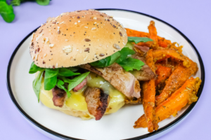 Accompagné de salade et de pommes de terre croustillantes, ce gourmandissime cowboy burger est garni de bœuf, de lard et d’œuf au plat.