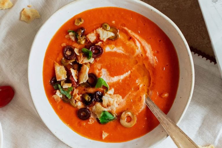 Servi avec des olives toastées et des gressins plats, ce velouté à la tomate et à la patate douce est une savoureuse entrée relevée de ...