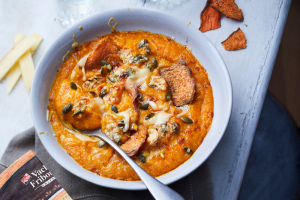 Le Vacherin Fribourgeois, délicieux fromage suisse, met son fondant fruité en scène dans cette recette de velouté de patate douce, céleri et potimarron, servi avec ...