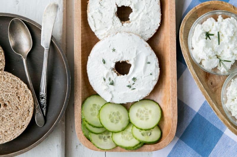- Etaler le fromage de chèvre fouetté sur les bagels préalablement toastés. Couvrir de quelques tranches de concombre. Déguster !