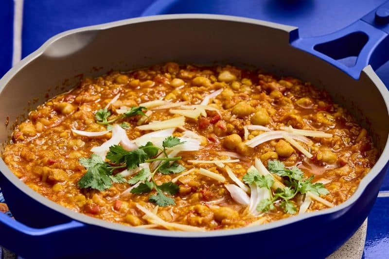 « Au Pakistan, le Chana Masala n'est pas le premier plat auquel on pense lorsqu'on reçoit. C'est un plat du quotidien, un simple curry de pois chiches réconfortant. Ma mère le préparait quand j'étais malade, et c'est peut-être justement pour cette raison que j'adore l'inclure dans mes dîners. Riche en épices aux vertus réparatrices comme le gingembre et le curcuma, c'est un plat que je trouve parfait pour la saison. Une autre raison pour laquelle je l'apprécie : il se prépare tout seul. Une fois les épices torréfiées et la base préparée, il ne reste plus qu’à laisser mijoter tranquillement pour laisser les saveurs se développer. À la fin, les pois chiches doivent avoir une consistance épaisse et crémeuse.»