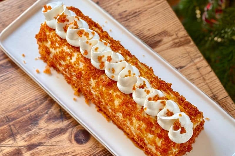 - Au moment de servir, enrober la bûche de poudre de caramel et décorer de chantilly.