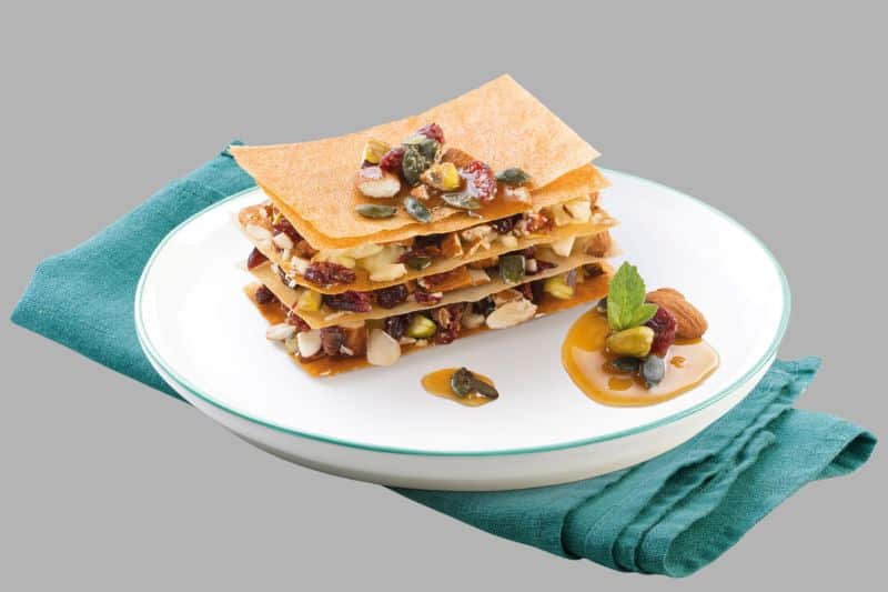 - Monter le millefeuille en alternant feuille croustillante et mélange fruits secs.