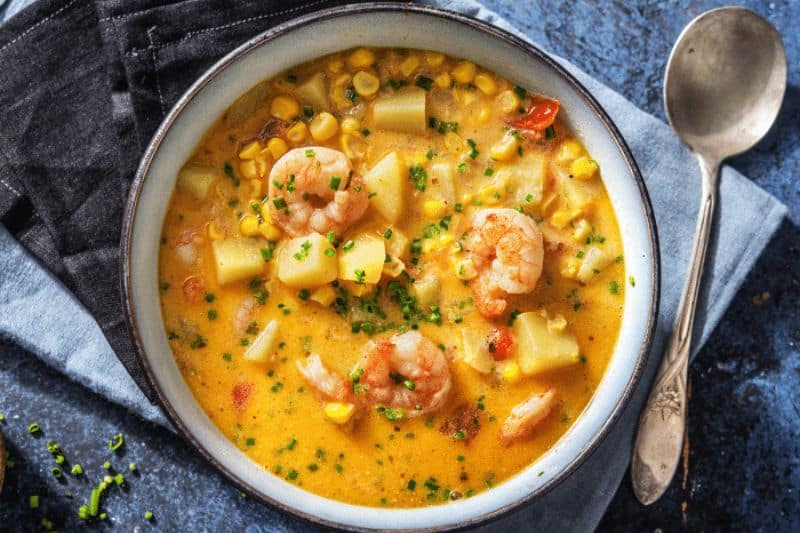 Bien épaisse, préparée avec du lait de coco, du maïs et de la tomate, cette soupe onctueuse aux crevettes est une variante exotique de la clam chowder, la crème de palourdes de Nouvelle Angleterre.
