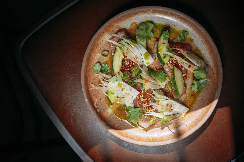 Thon cru mariné au saté, concombre, fenouil et coriandre
