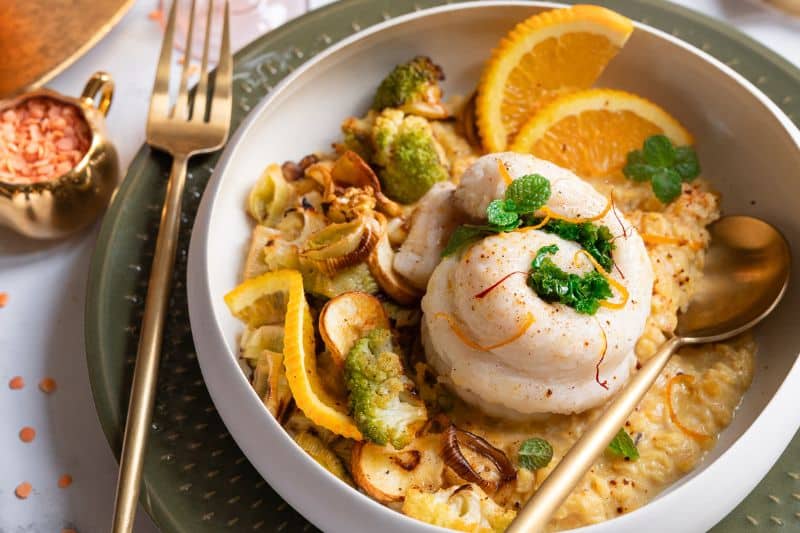 Tournedos de poisson blanc, lentilles corail crémeuses au safran et agrumes