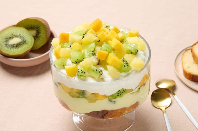 - Placer 4 tranches, en les chevauchant, dans le fond d’un saladier haut en verre. Ajouter une belle couche de crème pâtissière et une belle couche de fruits puis une couche de crème montée.
