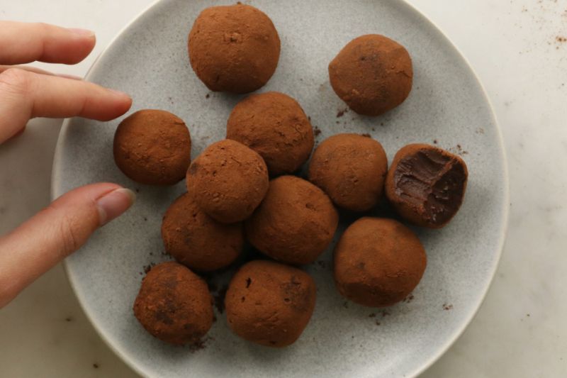 - Quand la pâte est bien dure, formez des petites boules de la taille d'une noix à l'aide d'une cuillère à café. Roulez-les ensuite dans le cacao en poudre. Déposez-les dans un plat.