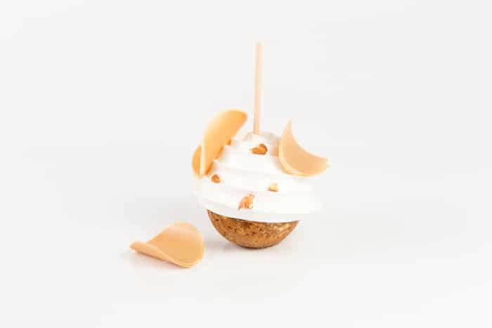 Une pâte à choux remplie de crème passion et cœur framboise et un glaçage à la pâte d’amande.